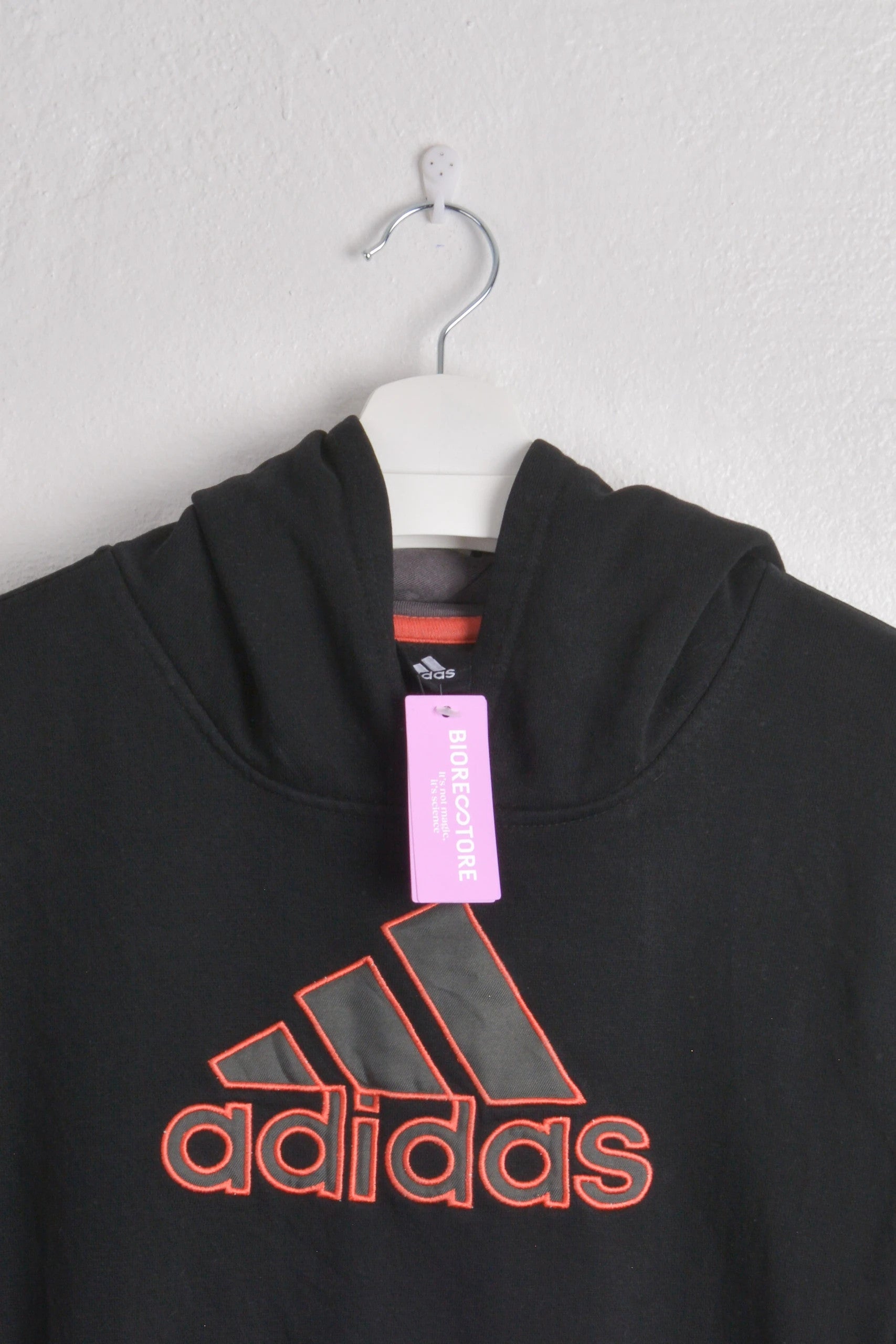 For sale: Cozy Adidas hoodie in black, size Large. Featuring a bold red logo design, this hoodie is perfect for your everyday comfort needs. It's in excellent condition, with tags still attached, ensuring you get a quality addition to your casual wear. Ideal for lounging or active outings. #adidas #womenadidashoodies #adidashoodie #hoodies #womenhoodies