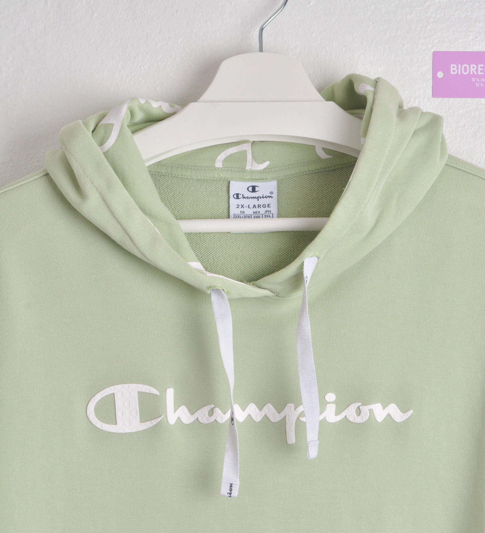 Refresh your wardrobe with this light green Champion hoodie! It's in excellent condition, hanging on a white...