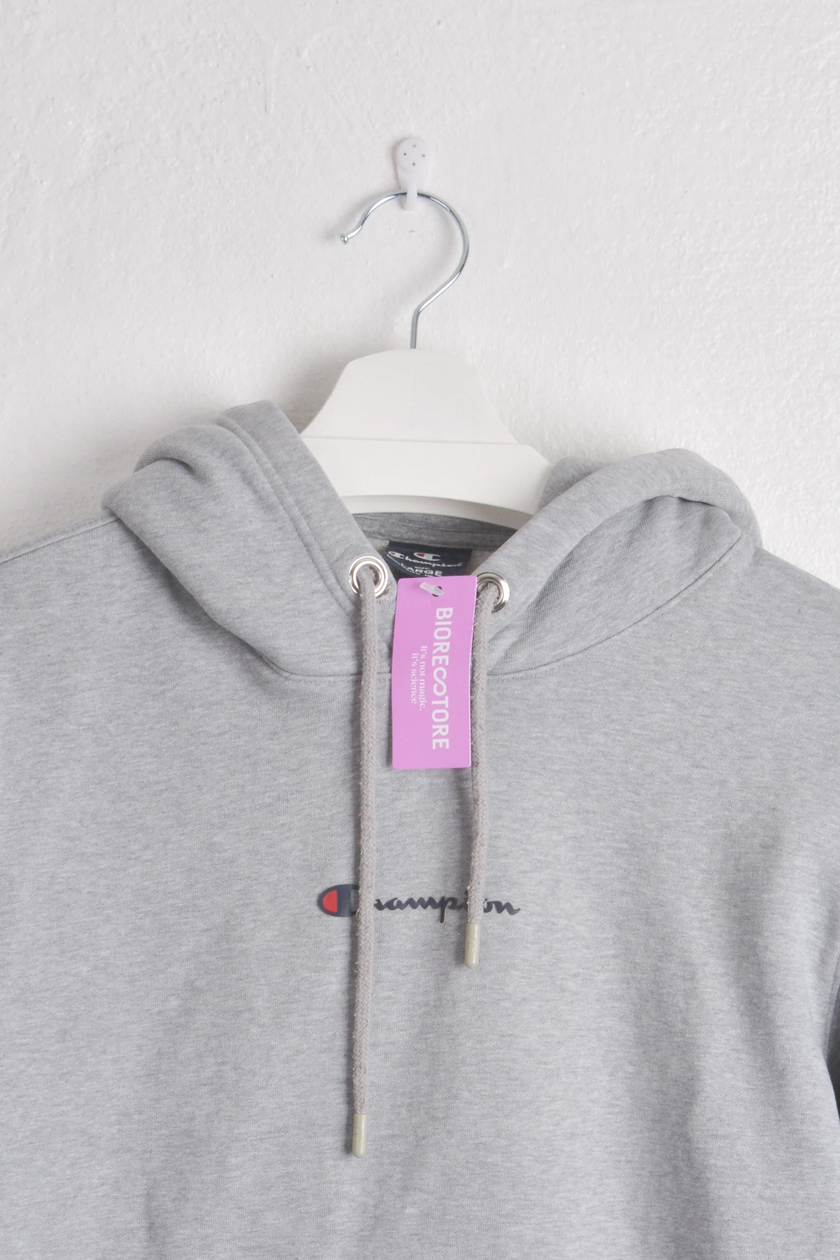 Champion hoodie in a soft heather grey, size Large. This hoodie features the iconic Champion logo on the chest and sleeve, adding a subtle yet stylish touch to a casual staple. It comes new with tags, making it a fantastic choice for adding to your leisurewear or for getting active outdoors. #champion #championhoodies #championwomenhoodie #womenhoodies #hoodies