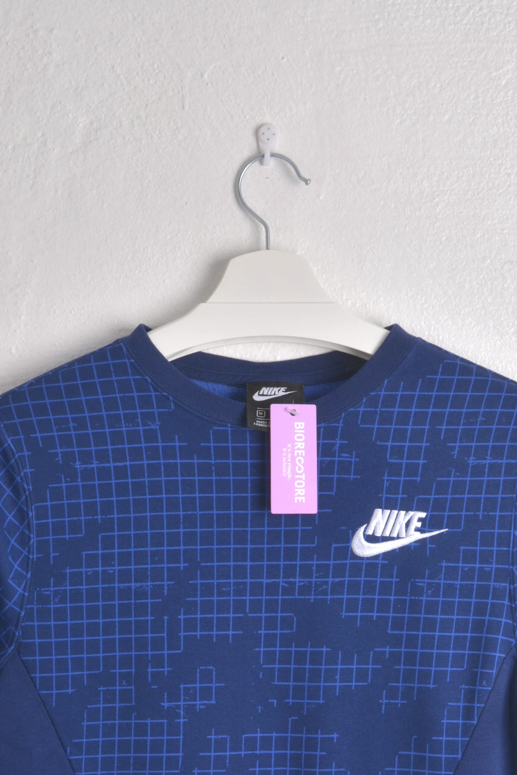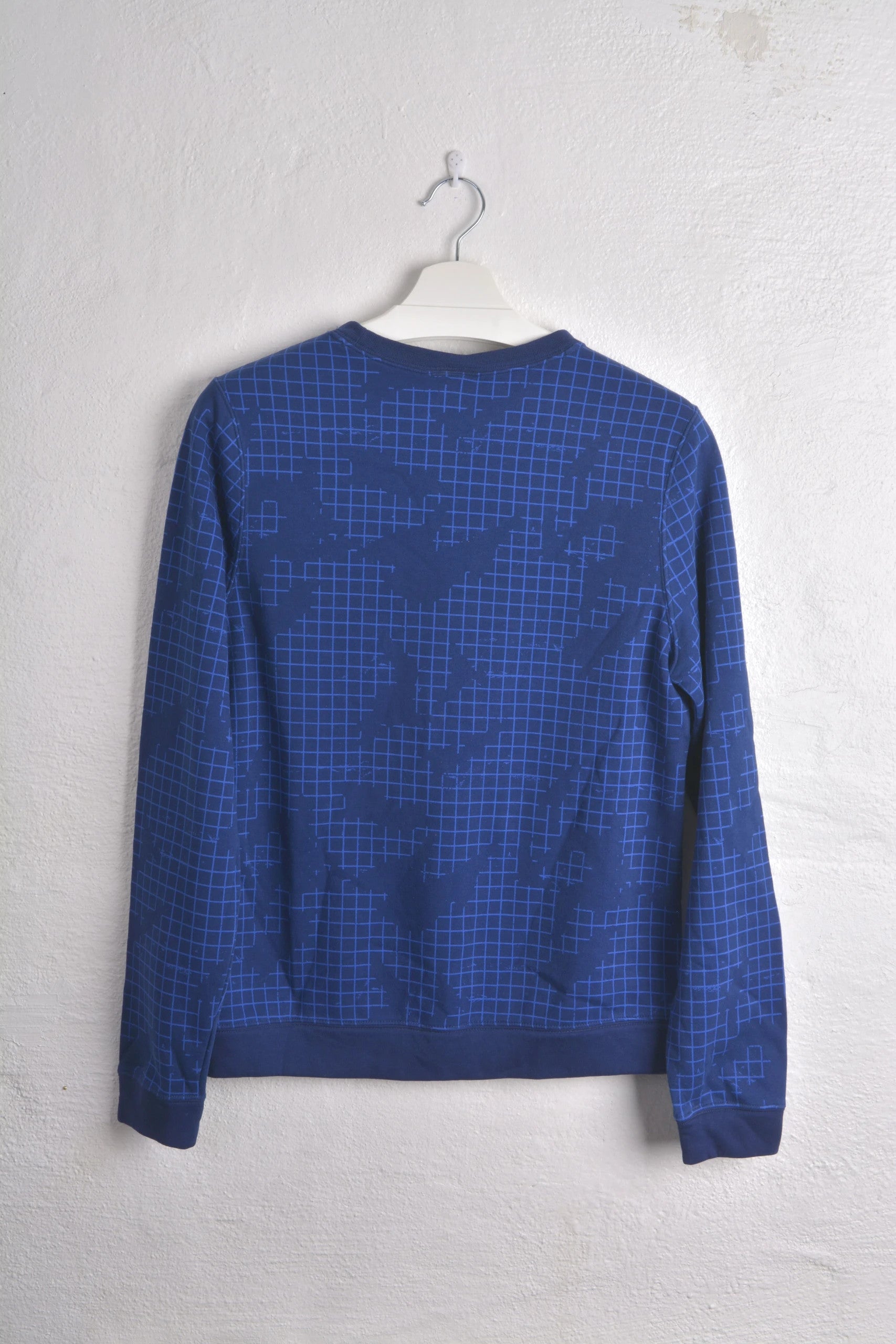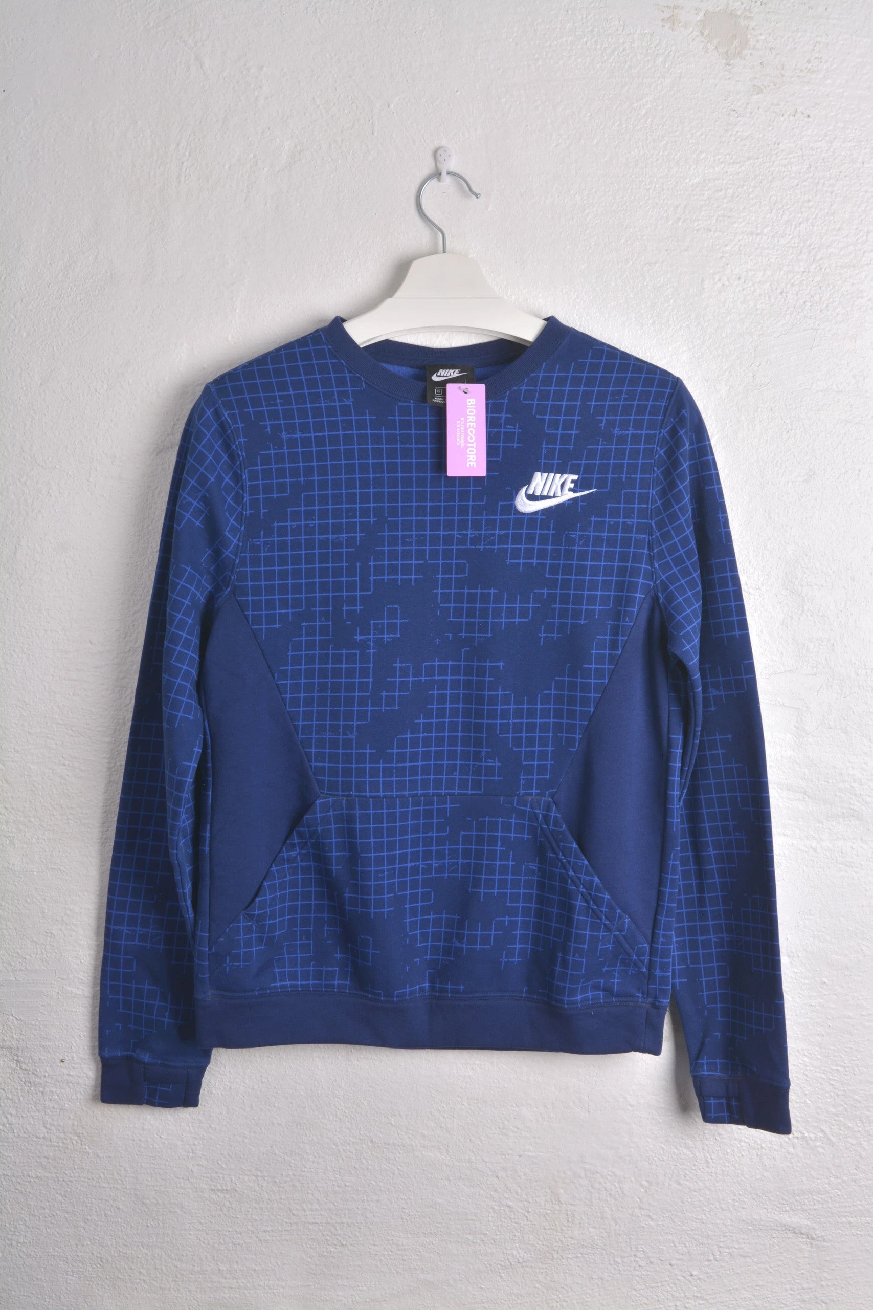 Add a modern twist to your wardrobe with this unique Nike sweatshirt, featuring a cool blue grid...
