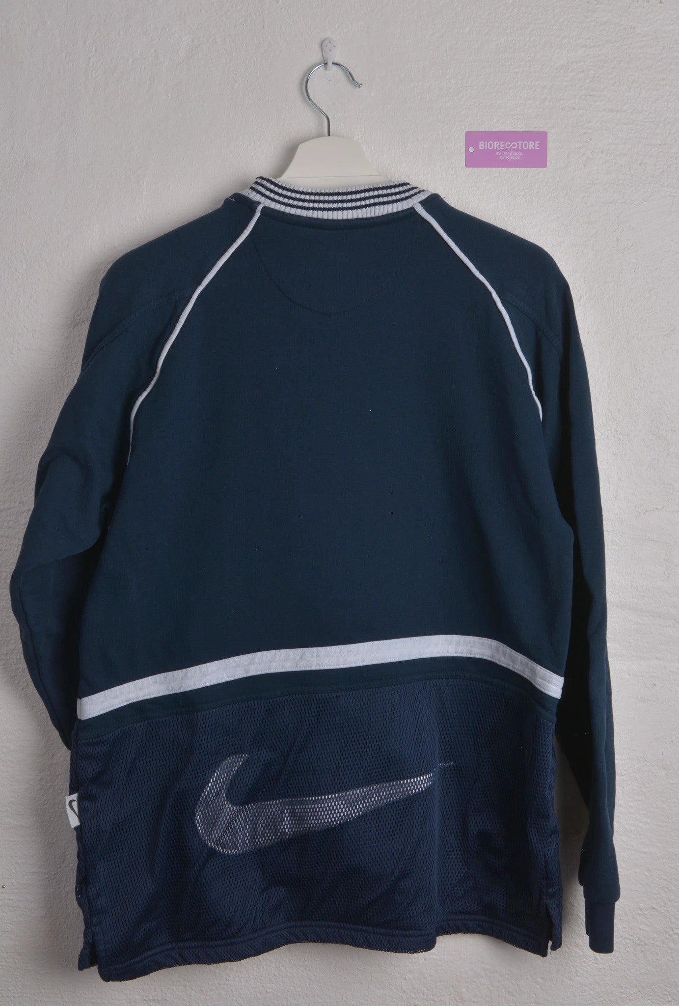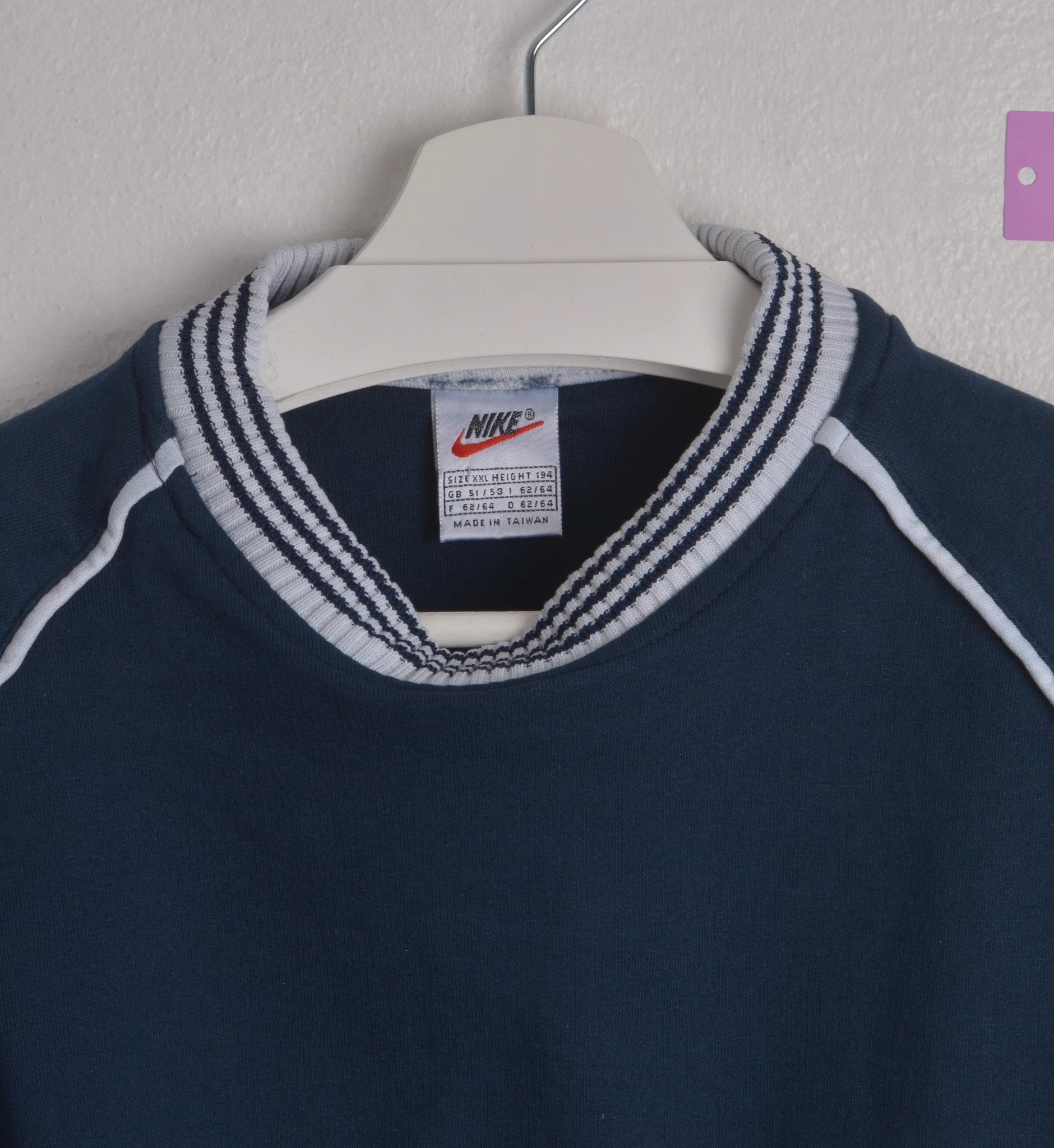 A timeless piece with a sporty edge, this Nike sweatshirt pairs the classic comfort of cotton with the iconic swoosh design. The contrast stripes add an athletic touch to this essential wardrobe staple, perfect for casual outings or your next workout session. #nike #brand #activewear #pullover #skatertop #menwear #menstyle #menpullover #oversizesweatshirt #white #navysweater